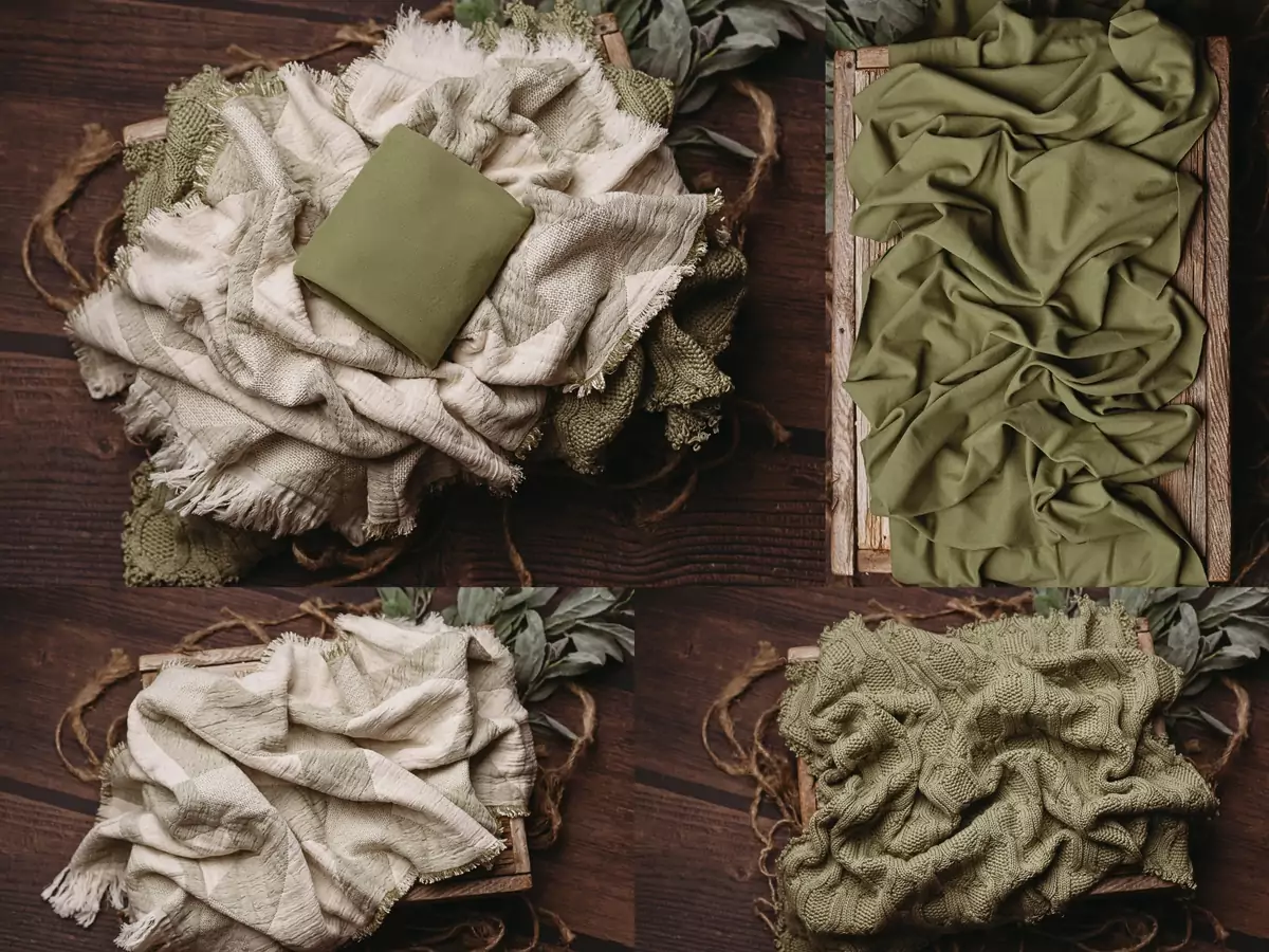 The stretch wrap provides a smooth foundation for wrapped poses, while the fringed blanket adds warmth and texture. The textured layer offers a softly worn, vintage-inspired look that brings depth without distraction. The green tones pair effortlessly with creams, ivories, and natural wood props, making this set ideal for organic and earthy newborn sessions.