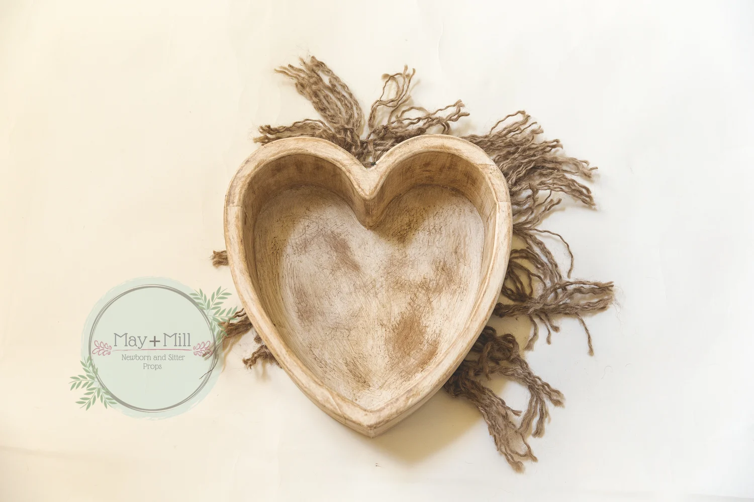 White heart-shaped newborn posing bowl crafted from solid wood, perfect for soft and neutral newborn photography styling.